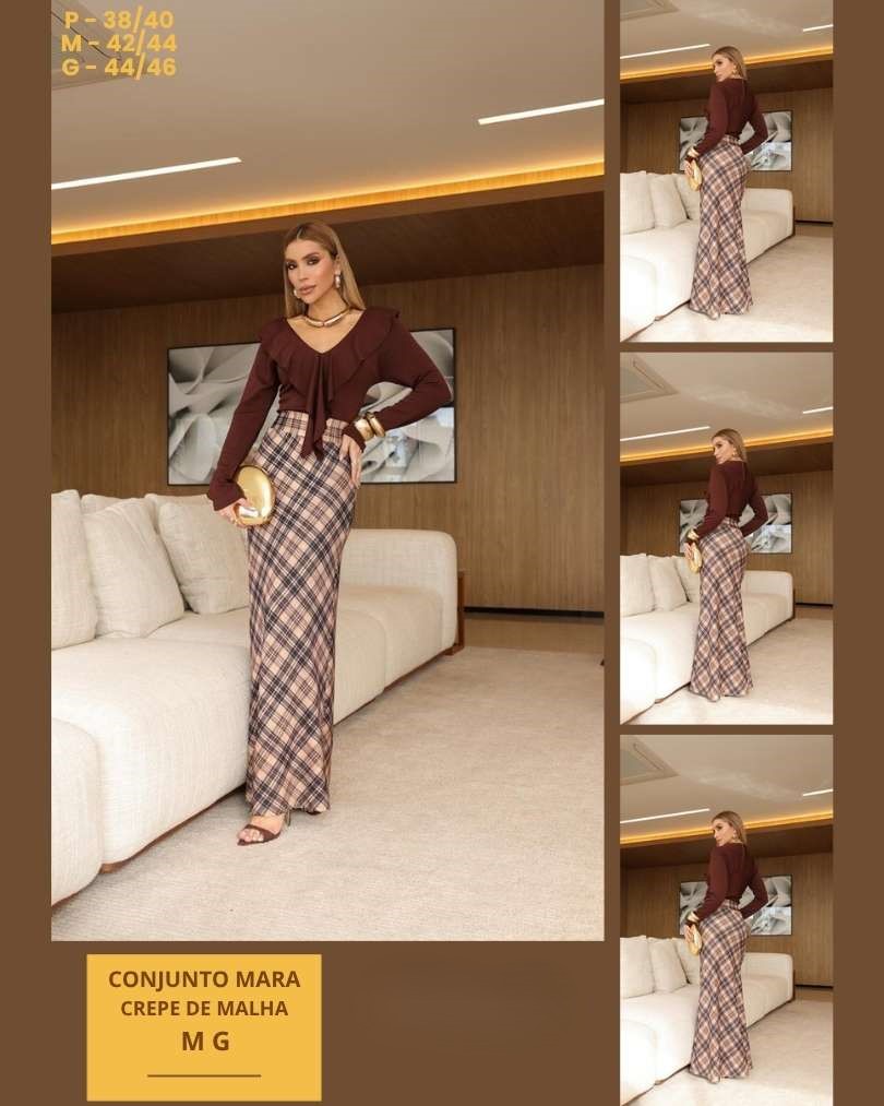 Descrição SAIA + BLUSA Confeccionado em Crepe de malha. -Confortável e respirável; -Não amassa com facilidade; -Valoriza o corpo com movimento natural; -Ideal para quem busca sofisticação com leveza