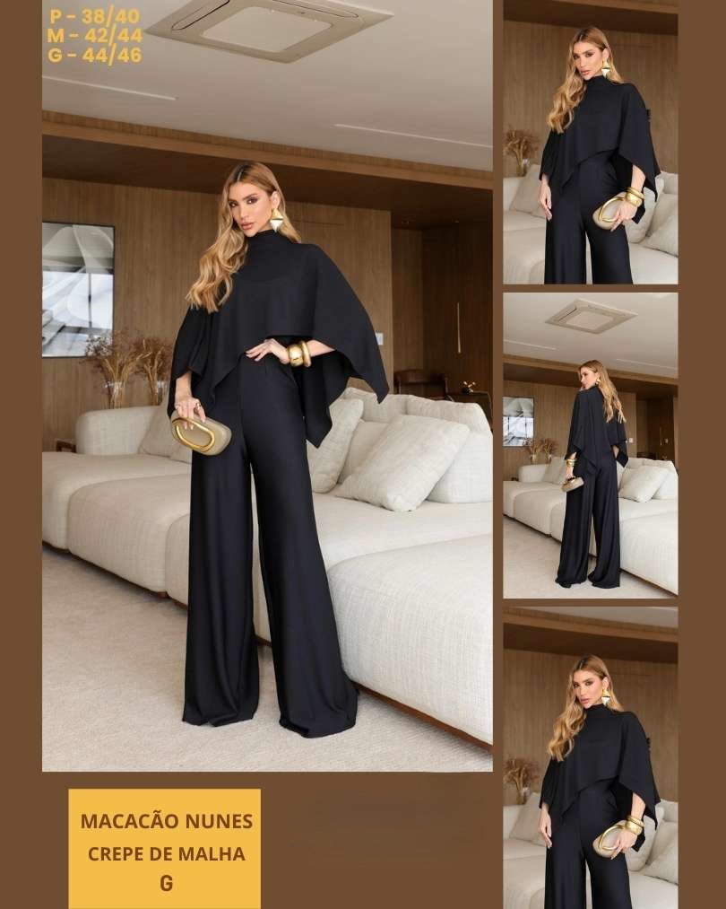 Macacão básico de alça fina com blusa capa! Transforme seu look com estilo! Esse macacão básico de alça fina é perfeito para qualquer ocasião! Com uma modelagem incrível, marcação na cintura e bolsos discretos. A blusa estilo capa que acompanha transforma completamente o look.
