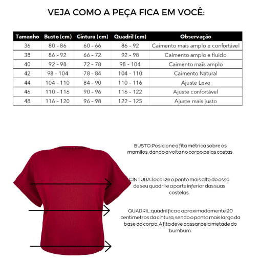 DESCRIÇÃO  Blusa produzida no fio modal com modelagem ideal ampla e leve. MEDIDAS  Comprimento: 56 cm Largura: 56 cm Cava: 20 cm Medidas aproximadas – Peça possui elasticidade COMPOSIÇÃO  88% acrílico e 12% poliéster