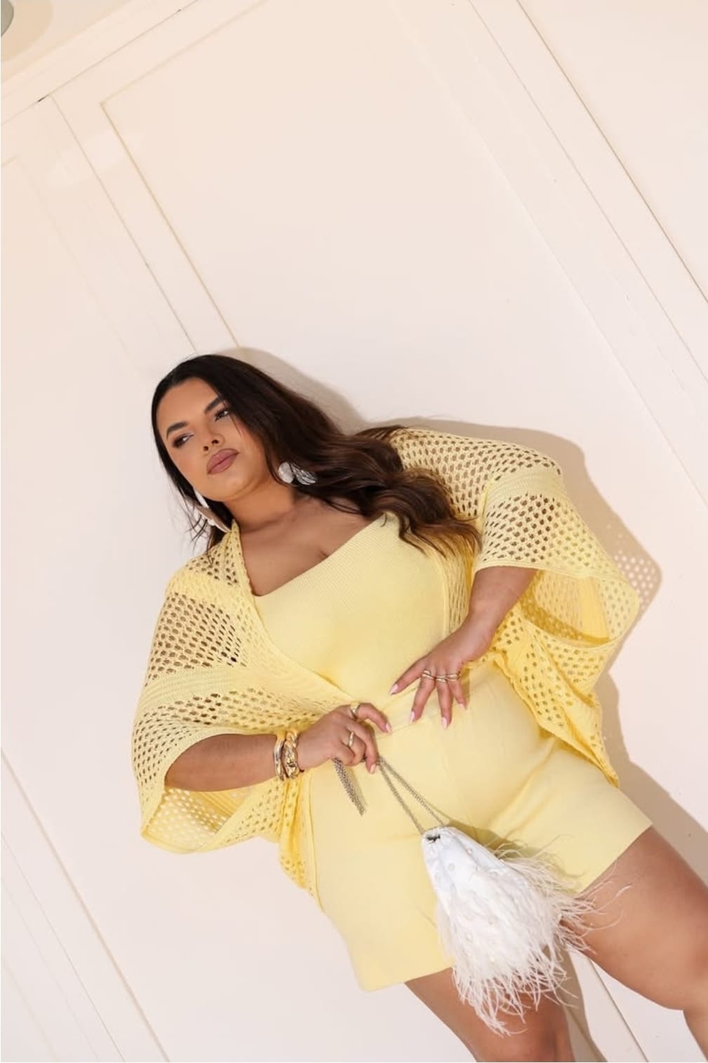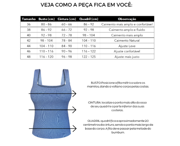 A peça adapta-se aos manequins do 38, apresentando um caimento mais solto, até o 48, com um caimento mais ajustado. Confira as medidas das modelos na referência abaixo.