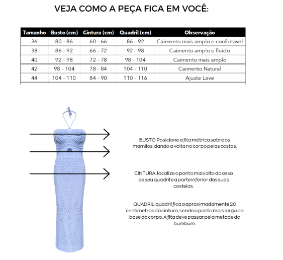 A peça adapta-se aos manequins do 38, apresentando um caimento mais solto, até o 44, com um caimento mais ajustado. Confira as medidas das modelos na referência abaixo.